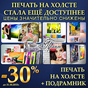 С 07.10.15 по 31.10.15 печать на холсте и натяжка на подрамник со скидкой 30%.